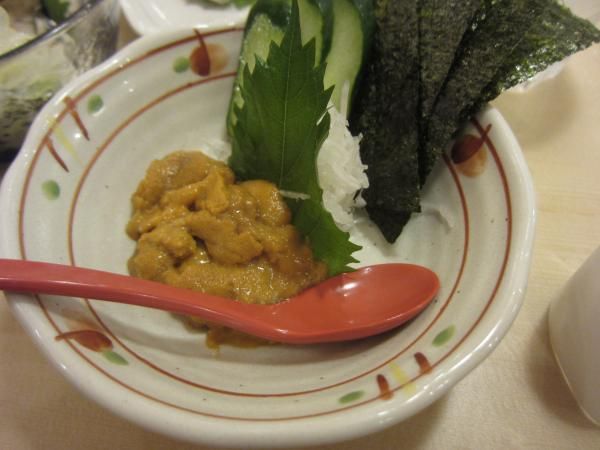 生うに。海苔ときゅうりと一緒に食べて、お酒に合いますね。