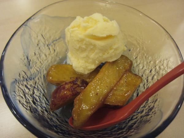 さつまいもスティックバニラ添え。温かいさつまいもスティックに冷たいバニラアイスが、温と冷のコラボで美味しいです。