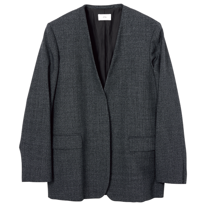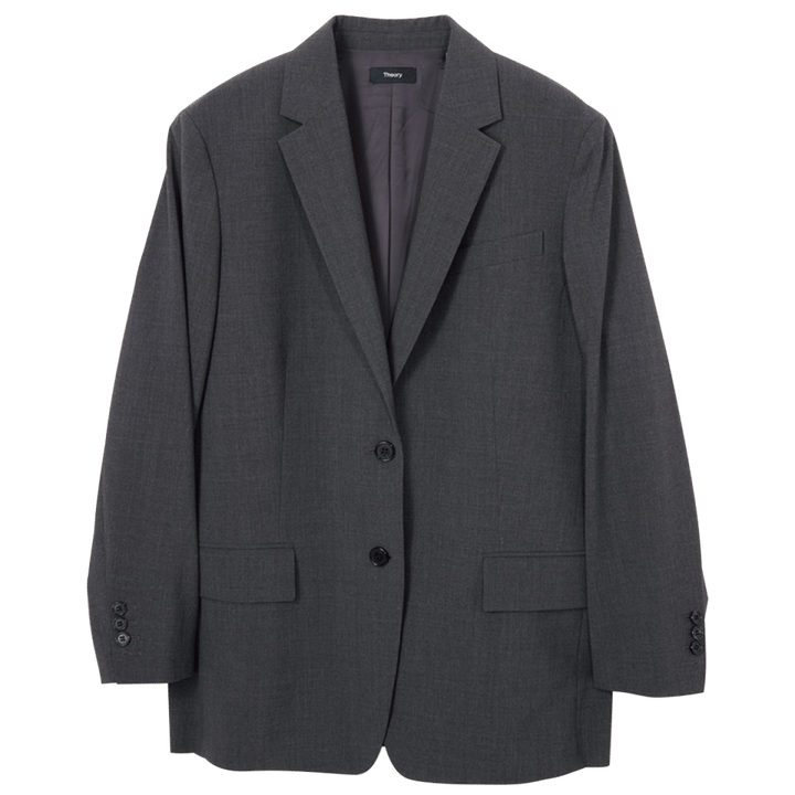 「定番素材のトレーサブルウールの新型ジャケットが、今季オーバーシルエットに進化。トレンド感を取り入れつつも、あくまでTheoryらしく、シンプルで使いやすいサイズ感です。フレアパンツと合わせるとよりこなれた印象に」(セオリー PR 比護つばささん)