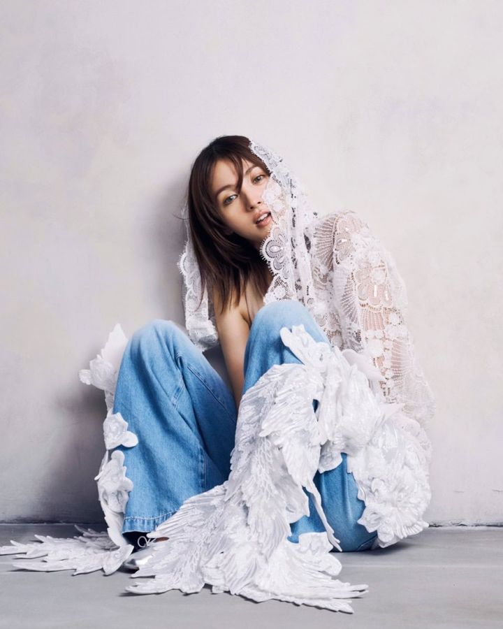 第5位は、レースのヴェールを纏ったスタイリングが印象的な満島ひかりさんの表紙のコーディネート。ウエストから裾まで天使の羽根が施された華やかなデニムパンツはダイスケタナカのコレクションライン。ヴェールと相まって、満島さんのピュアなムードを一層引き立てています。「表紙が印象的でした」というコメントも見られました。