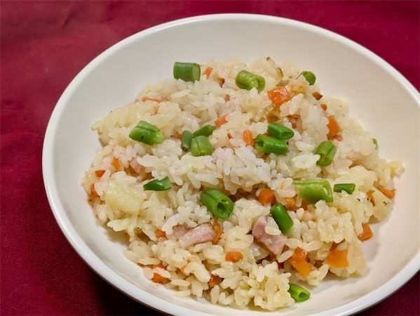 フライパンに油を熱し、1の野菜とベーコンを入れ炒め、火が通ったら米を加え、米が少し透明になるまで炒める。