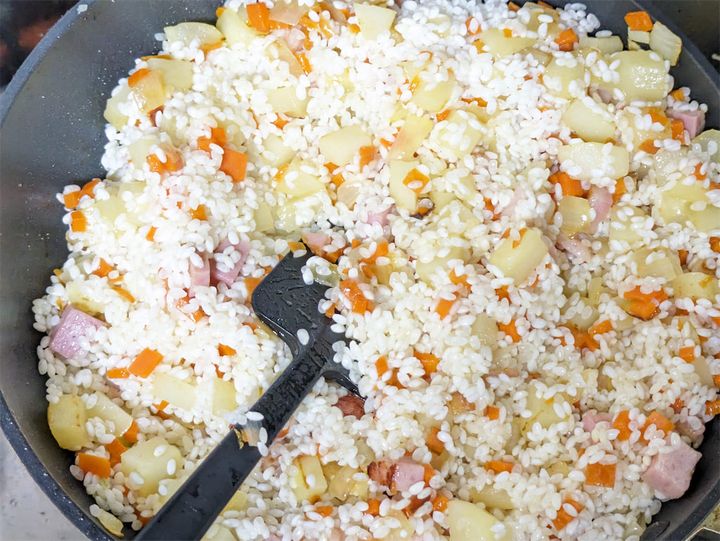 米を入れると、初めは白っぽいですが、炒めていくうちにだんだんと透き通っていくのがわかります。