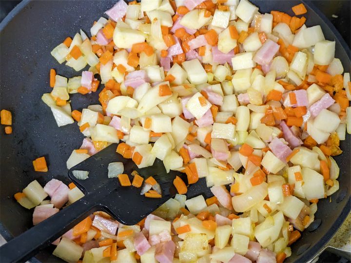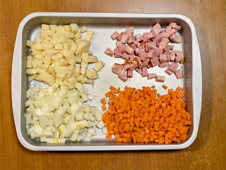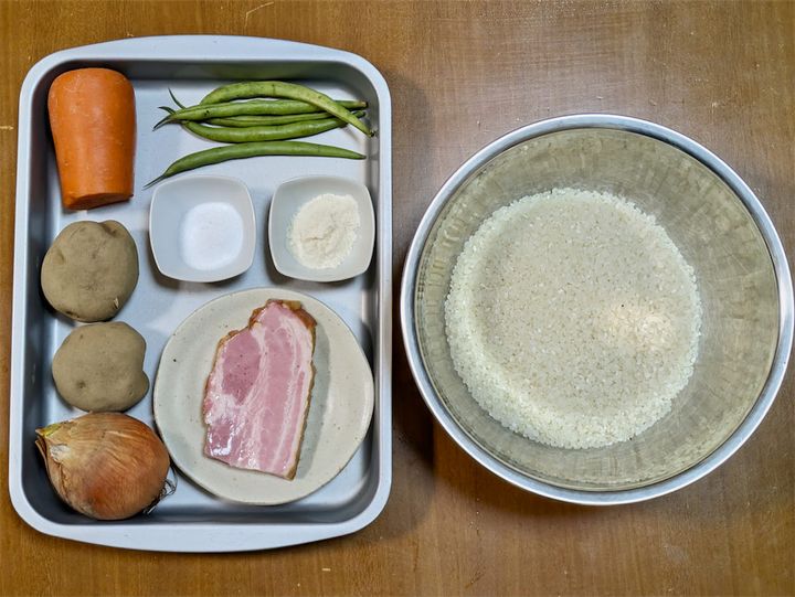 1.米は研ぎ、30分浸水させ、水を切っておく。じゃがいもは1cm角、玉ねぎ、ベーコンは7mm角、にんじんは5mm角に切る。