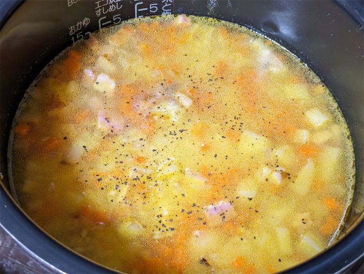 今回は、ワザと経験が必要とされる、スープを吸わせながら米を炊く部分を、炊飯器にお任せします。