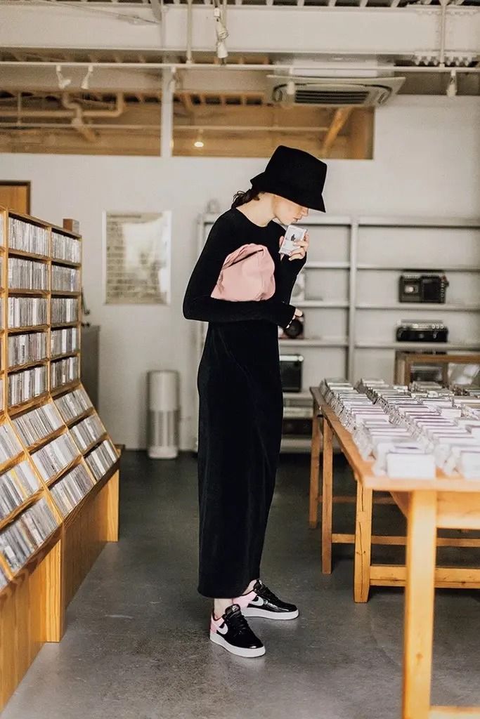 シックなベロアドレスに映える、エナメル加工の甘くて辛いバイカラー。スニーカーの配色にならって、小物も黒とピンクを分散。
