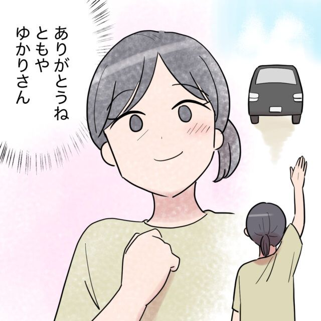 3人を乗せた車が走り去るのを見送りながら、よしこさんは心の中で(ありがとうね。ともや、ゆかりさん)を幸せな笑顔でした。