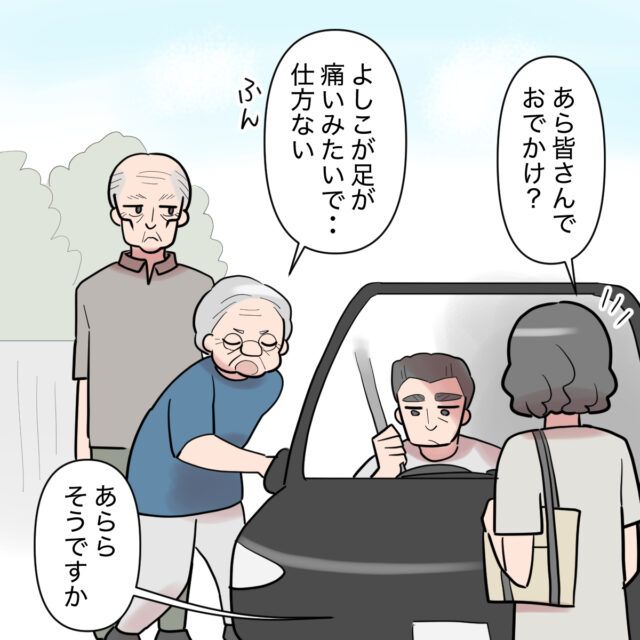 義父が運転する車に義祖父母が乗り込もうとするのを見て、お隣さんが声をかけました。