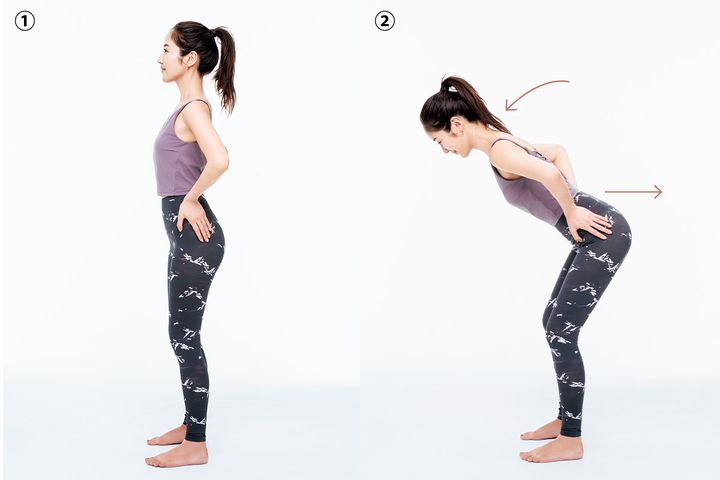 軽く膝を曲げ背中をまっすぐにして立ちます。そこから45度上半身を前に4秒かけて倒します。腰痛の人は無理のない範囲で。