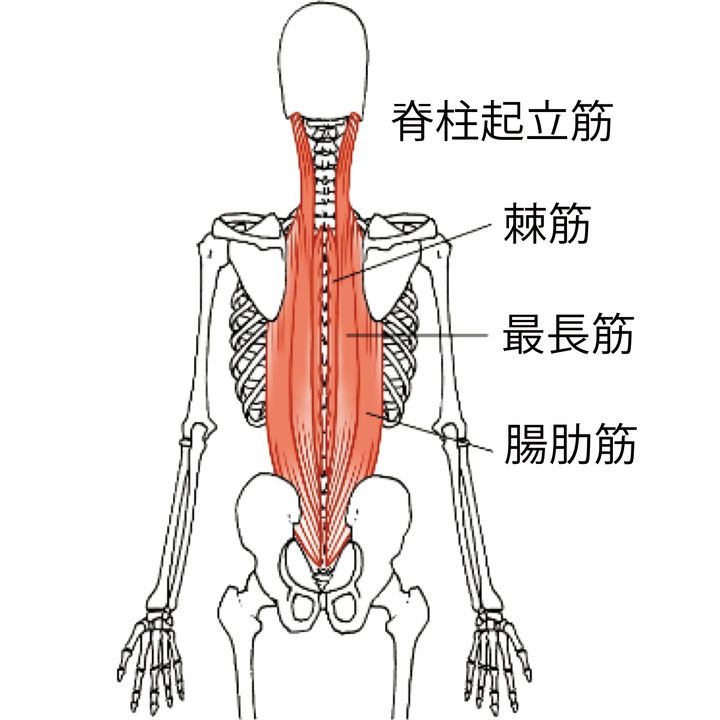 脊柱起立筋は腸肋筋、最長筋、棘筋という三つの筋肉の総称。腹直筋・大臀筋などと共に抗重力筋と呼ばれ姿勢を保つための重要な筋肉。