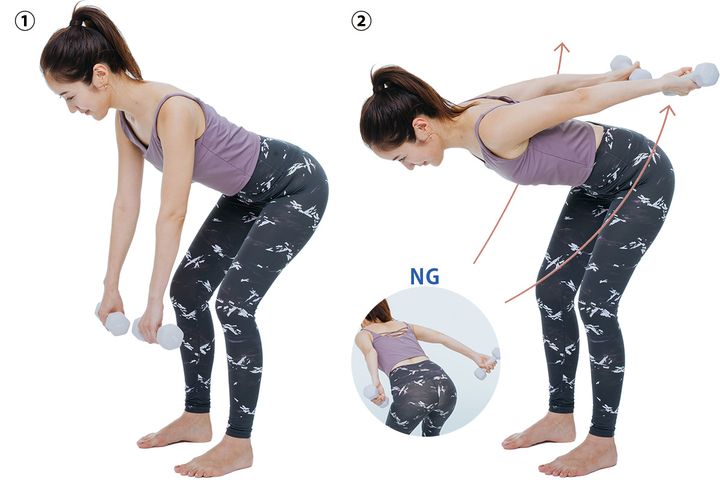 前傾姿勢のままダンベルを後方に引き上げる。腕が床と並行になるくらいまで後方に上げられればOK。8回×1セット行う。