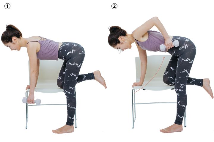 片手と膝をいすやローテーブルなどに置いて逆の手でダンベルを持ち、ダンベルを持った手はまっすぐ下におろします。