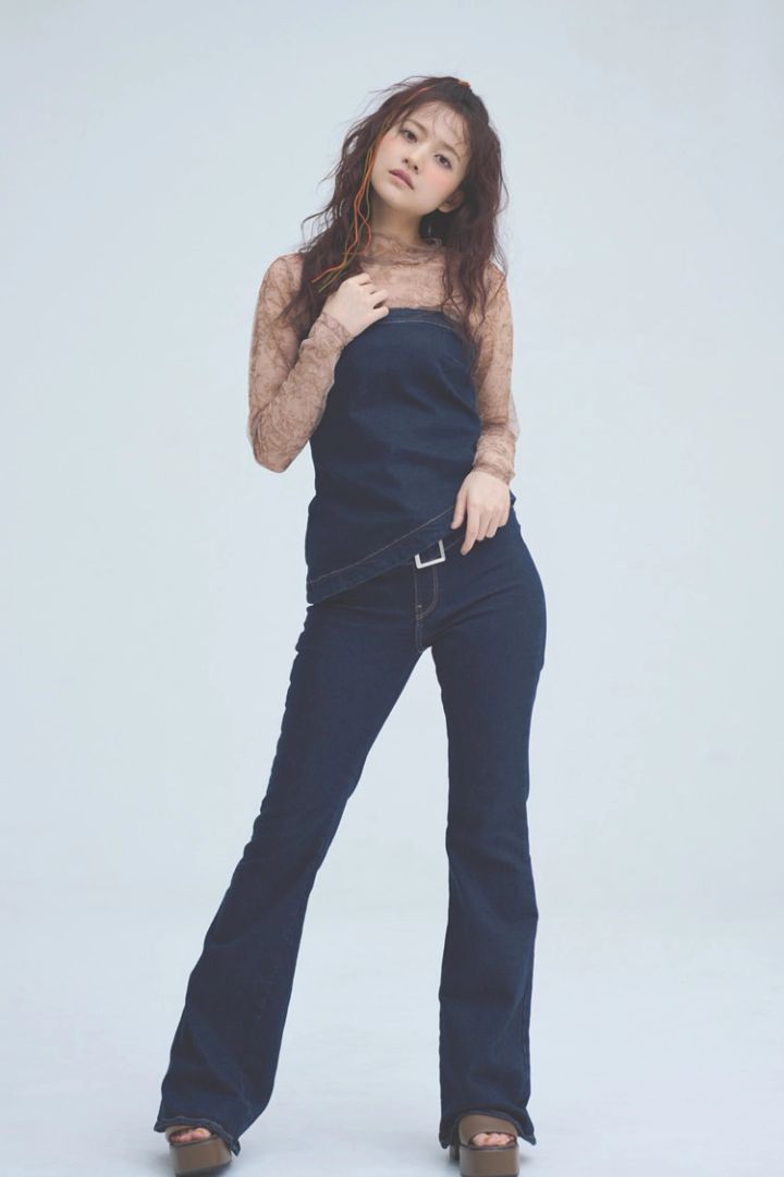 デニムビスチエ 5,990円、ベルトつきフレアーデニムパンツ 8,990円/ともにMANGO シアーカットソー 6,600円/MERCURYDUO ルミネエスト新宿店 サンダル 4,399円/WEGO