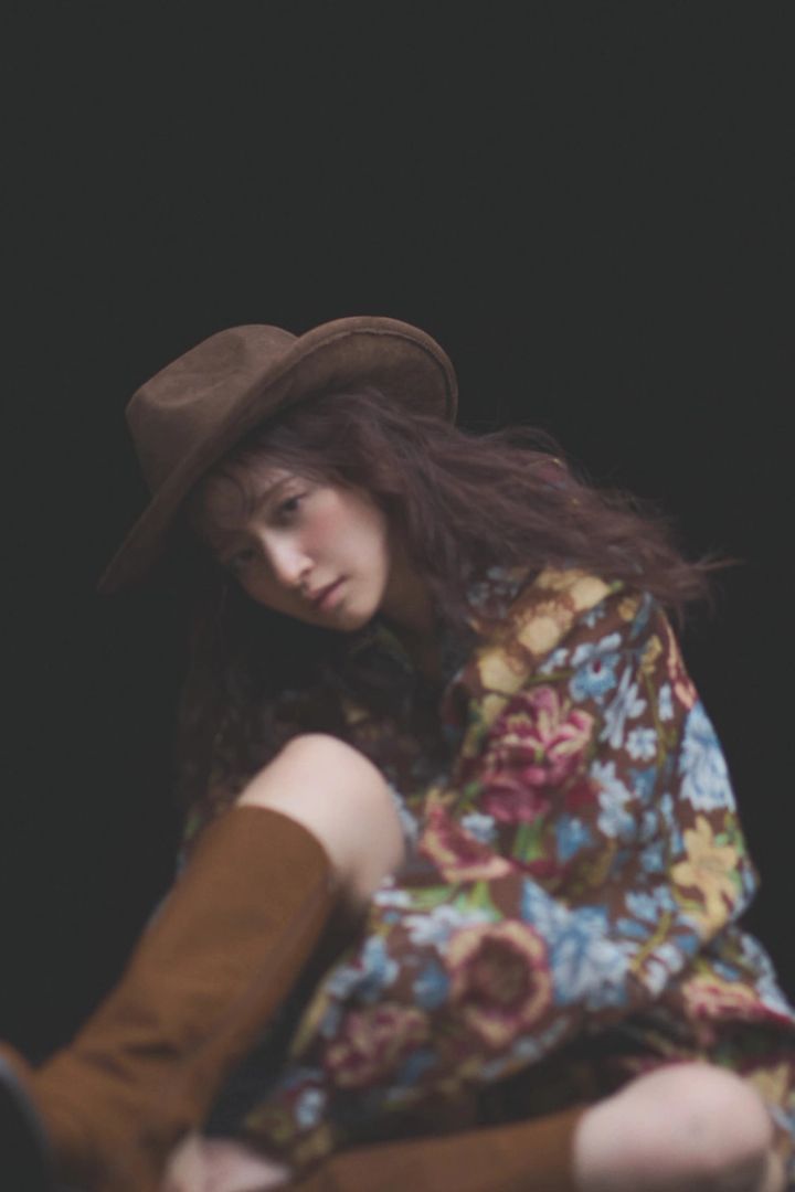 ブラウンハットとブーツ、ゴブラン織りの花柄ブルゾンとショーパンのセットアップ。全身で魅せるカウガールコア。