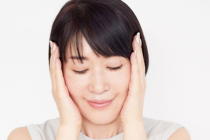 1円玉大の化粧水を手のひら全体に広げ、顔の内側から外側へ少しずつずらしながらハンドプレス。