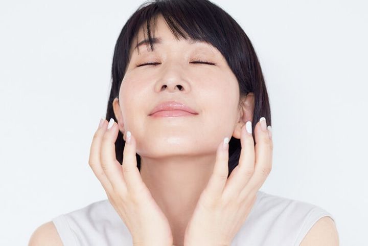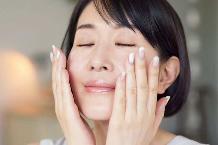 洗顔後、少量の乳液を手のひらに広げて顔を包むようになじませる。