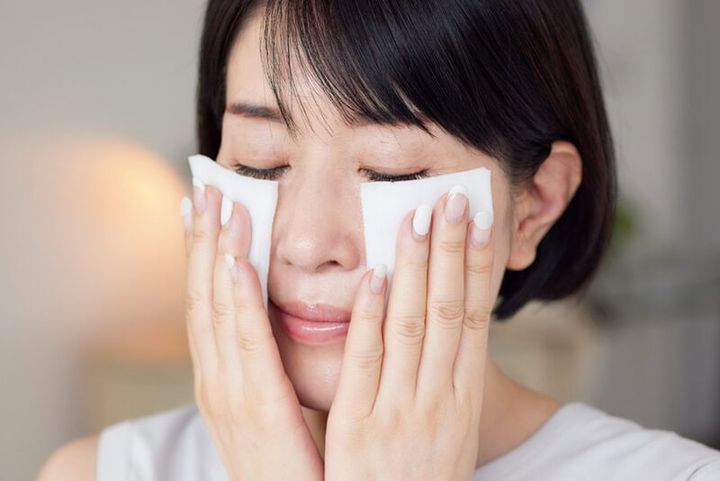 たっぷりの乳液を顔の内側から外側へくるくるマッサージしながらなじませた後、お湯にひたしたコットンで30秒間ふやかし、優しくふきとる。