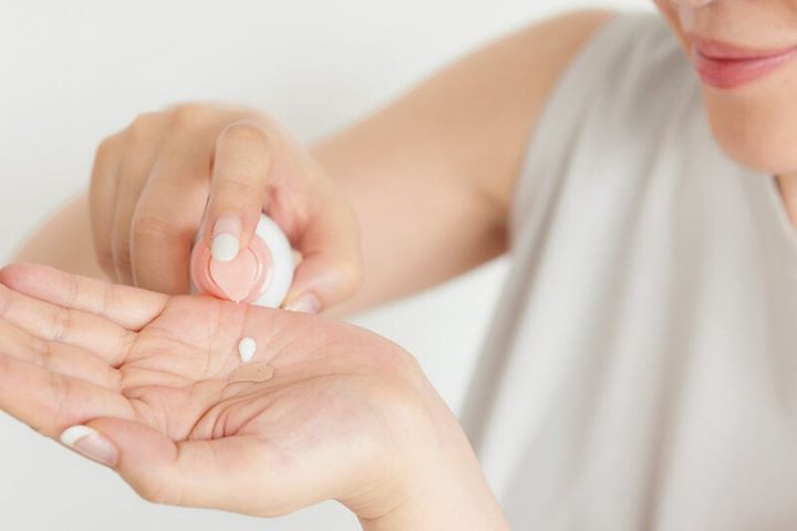 乳液を手のひら全体に広げ、乾燥しやすい外側から皮脂の出やすい内側へとずらしながらつける。