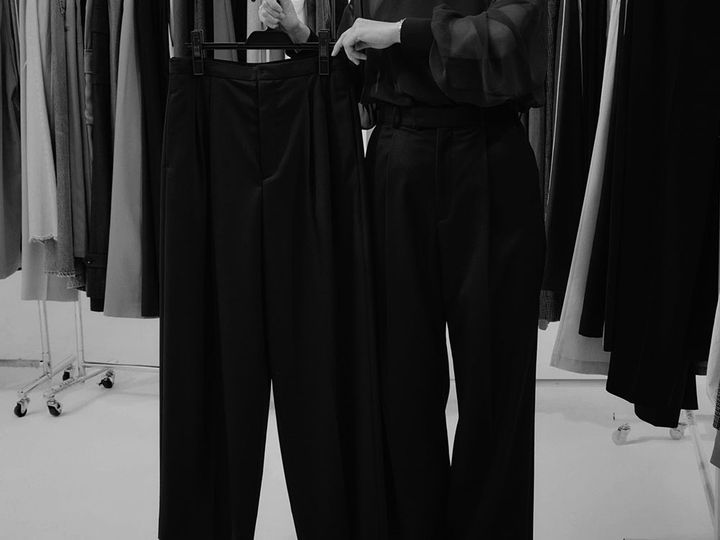 メリハリが生まれる太ベルトデザイン! 広がりが控えめなワンタック一択。ウール100%の張り感素材はまるでコルセットをつけてるかのような一切無駄がないシルエットに。