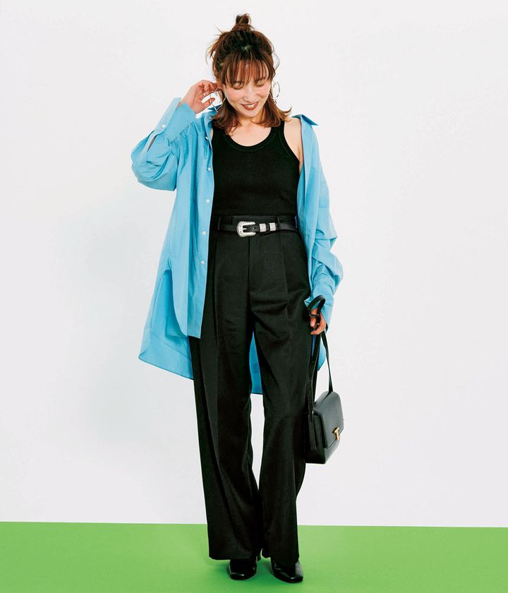 パンツ¥53,900(エイトン/エイトン青山)シャツ¥39,600(カオス/カオス丸の内)タンクトップ¥8,800(ハイク/ボウルズ)バッグ¥62,700(ジョン グライソン/アルアバイル)靴¥28,600(ダイアナ/ダイアナ 銀座本店)ピアス¥62,700(ヌゥ ユゥ/アイネックレス)リング¥37,400(ブランイリス/ブランイリス トーキョー)ベルト¥38,500(J&M デヴィッドソン/J&M デヴィッドソン カスタマーセンター)