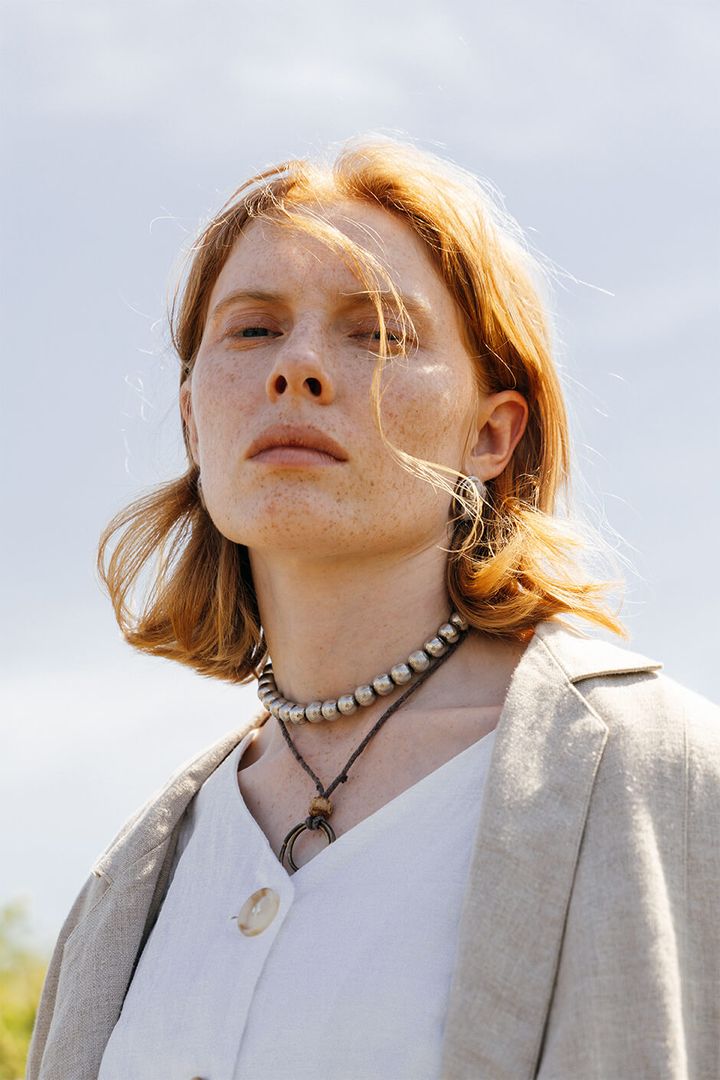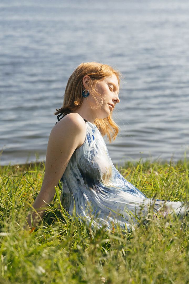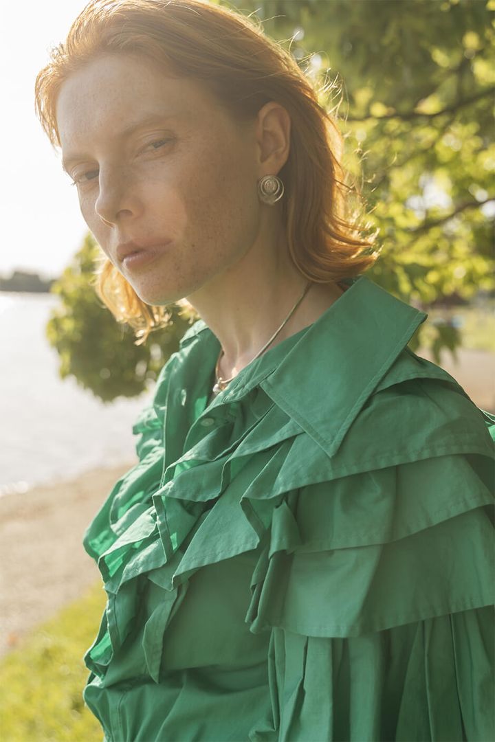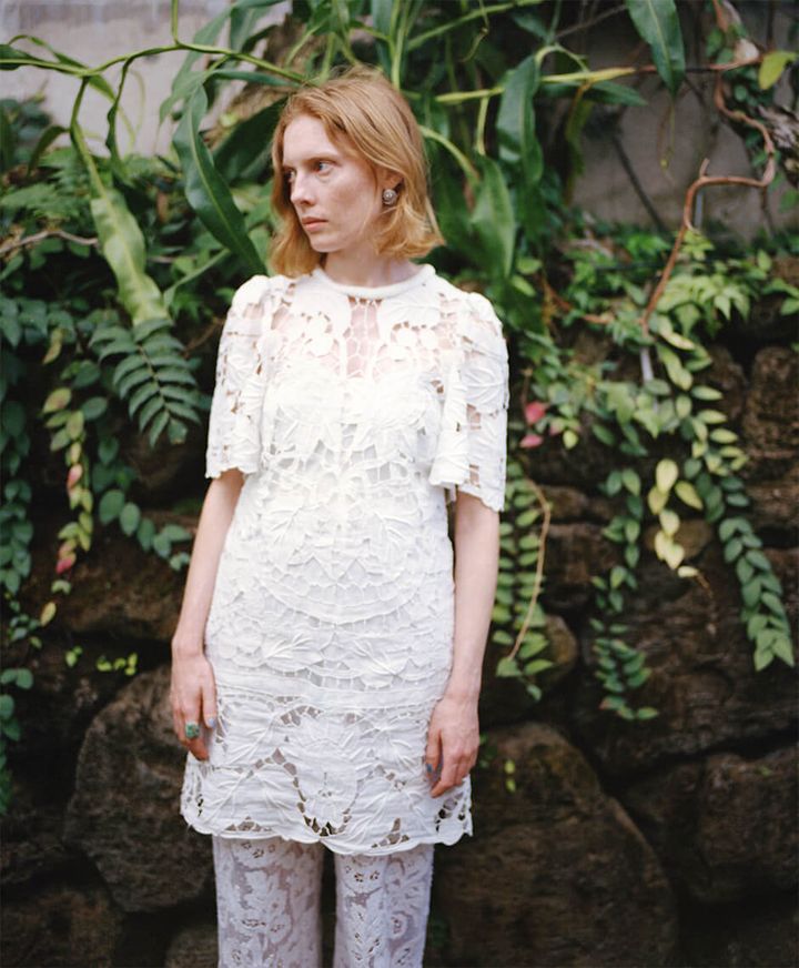 dress by ATSUSHI NAKASHIMA, necklace by DOUBLEW, earrings by PUPIL CASKET