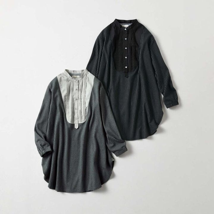 カットソー素材をベースに、顔まわりに布はくをあしらい、大人モードな印象のチュニックは、顔うつりまで考慮した優秀アイテム。グレーは明るいライトグレーの切り替え生地で顔まわりが華やかに、ブラックは引き締めカラーとピンストライプの生地でシック&シャープに。なりたい印象に合わせて選んでみて。前ボタンが全開しない仕様ですきま風を防ぎ、おなかまわりもふんわりあたたか。