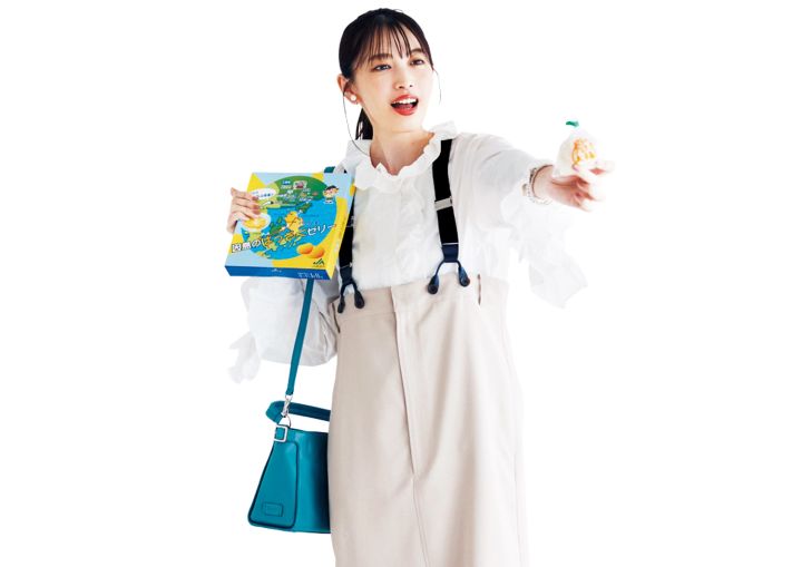 フリルブラウス¥20,790/APEL サスペ付きジャンスカ¥24,200/リエル リシェ グリーンバッグ¥39,600/銀座かねまつ(銀座かねまつ6丁目本店) シルバーパンプス¥16,500/ダイアナ(ダイアナ 銀座本店) ストール¥5,940/MERCURYDUO(MERCURYDUO ルミネエスト新宿店) 3連ブレス¥19,800/フィリップ オーディ はっさく大福、因島のはっさくゼリー/編集部私物