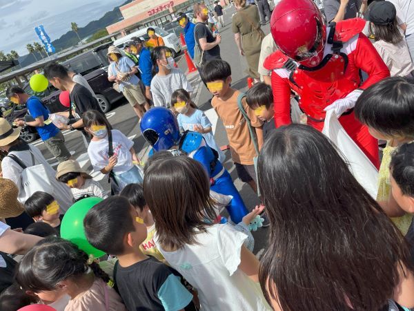 子どもたちにお菓子を配る”笑興戦隊ジバサンギョー”