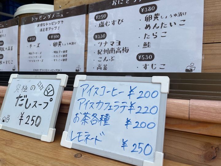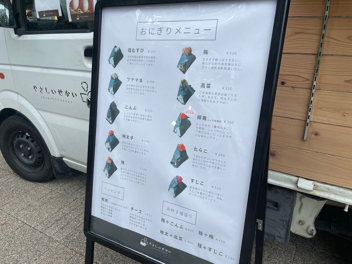 やさしいせかいは、おにぎりをメインで出されているキッチンカー。 キッチンカー形式ではありますが、おにぎり専門店さながらの豊富なメニュー展開です。 いちばんお手頃な250円の塩むすびから、高級な530円のすじこまであり、さらにチーズや卵黄などのトッピングも追加できます。