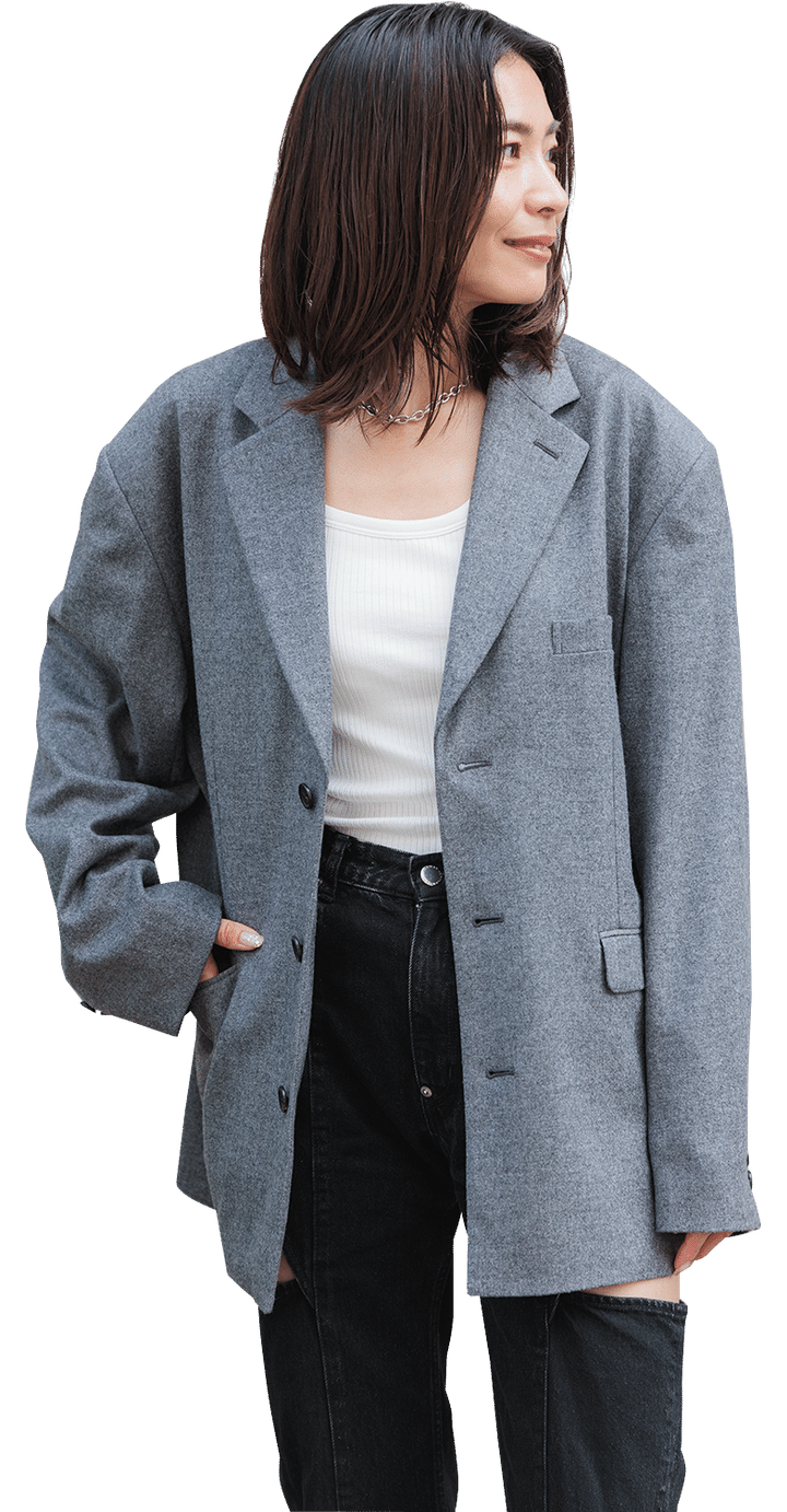 「軽くて柔らかいフラノにカシミアをブレンドした贅沢な着心地のジャケット。オーバーサイズなシルエットを引き立たせるために、他はシンプルなアイテムに。丈や身幅、カラーなど、自分好みの1着です」