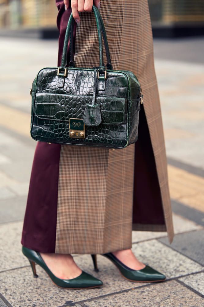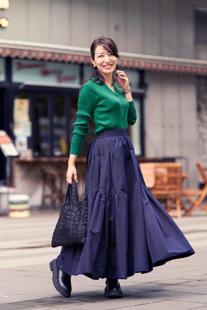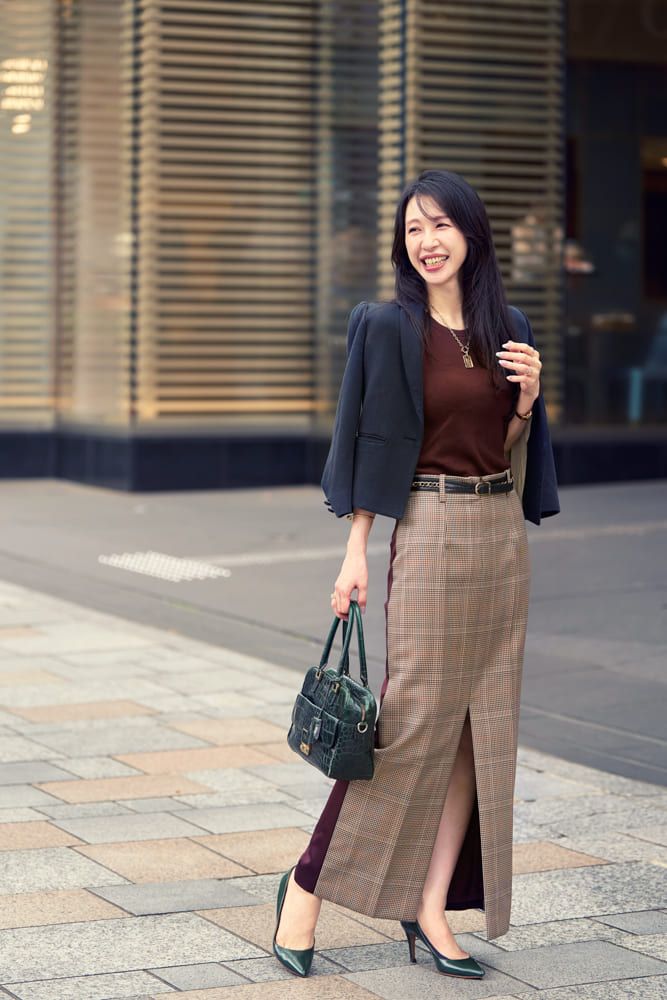 チェック柄とブラウンのサテンが前後異素材になったお気に入りのタイトスカートに合わせたくて、今季NEWカラーで登場したユニクロのブラウンタンクを購入。背面のブラウンサテンとバッチリ色味があって、この時期はセットでよく着ています。バッグとシューズの小物は、ブラックやブラウンではなく、敢えてグリーンを合わせることで、洒落感がアップし、こっくりした秋コーデに見せてくれます。