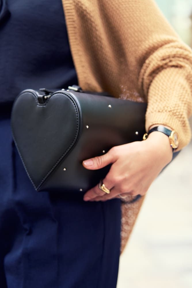 秋になってもまだ暑さが続きそうな予感だったので、秋色の羽織りが欲しいと思い、こちらのカーディガンを購入。ブラウスもユニクロで、ボウタイ付きのデザインが今っぽくてコーデを華やかに見せてくれるのでお気に入り。カーディガン以外のアイテムを全てダークカラーで揃えることで、キャメルカラーのカーデを主役に。バッグはスタッズのついたハート形で、コーデに遊び心をプラスしました。