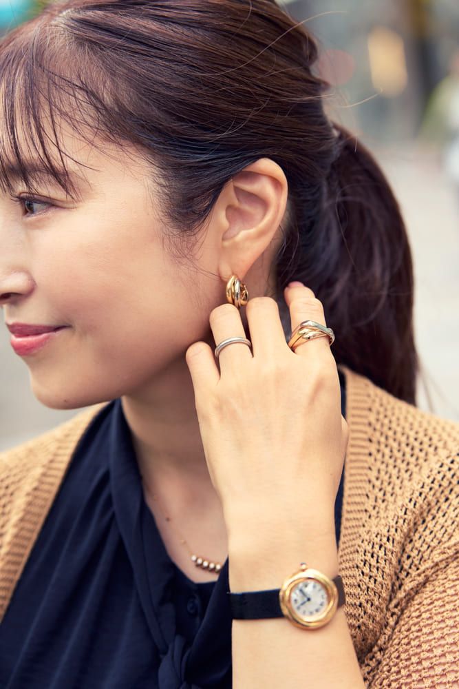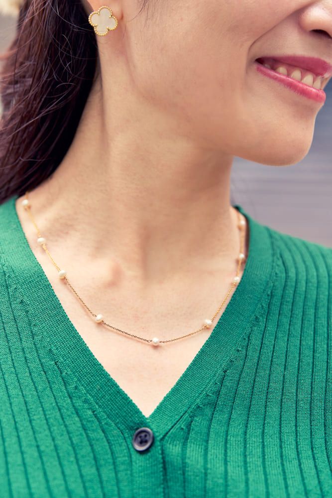 ついベーシックカラーを選びがちですが、時々色物が着たくなり、そんな時はユニクロで手頃に取り入れることも。お気に入りのSHE TOKYOのボリュームスカートと合わせることで高見えに。信頼感のあるブランドと合わせることでユニバレせずに着られます。またジュエリーはパールでエレガントさを強調。トップスにカラーを持っていき、目線をあげることで低身長をカモフラージュしてスタイルアップ効果を狙います。