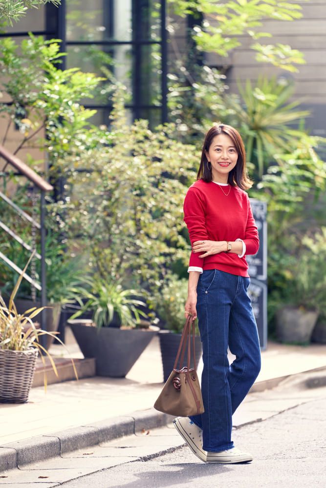 「赤ニット」が主役のカジュアルコーデで秋気分を満喫!