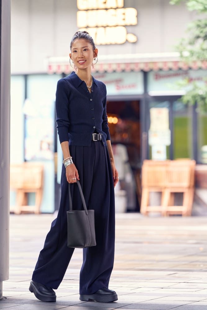 今季マイブームのネイビーワントーンコーデは、ラインが綺麗なカレンソロジーのワイドパンツが軸。ユニクロのポロニットはコンパクトなサイジングが絶妙!シルバーに統一したジュエリーでクールなコーデに華やかさをプラス、太めの存在感あるベルトで引き締めて、スタイルアップ効果を狙いました。