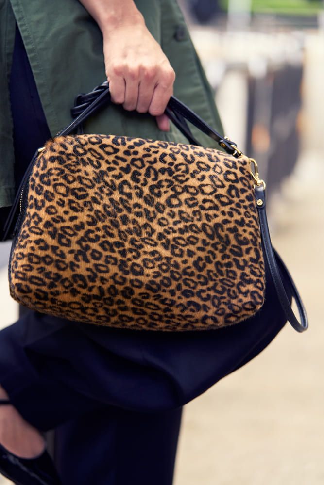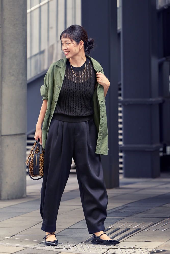 今季購入したビックシルエットのカーキジャケットには、女性らしさをプラスするために、トップスをユニクロのクロシェ編みの透け感のあるものに。無理のない肌見せを楽しみつつ、サテンパンツを合わせてきれいめにまとめました。トップスのインナーはサテンマットのような生地感のものをチョイスして胸元の開き具合と下着感が出ないように気をつけます。アニマル柄のハラコのバッグでコーデのアクセントを。