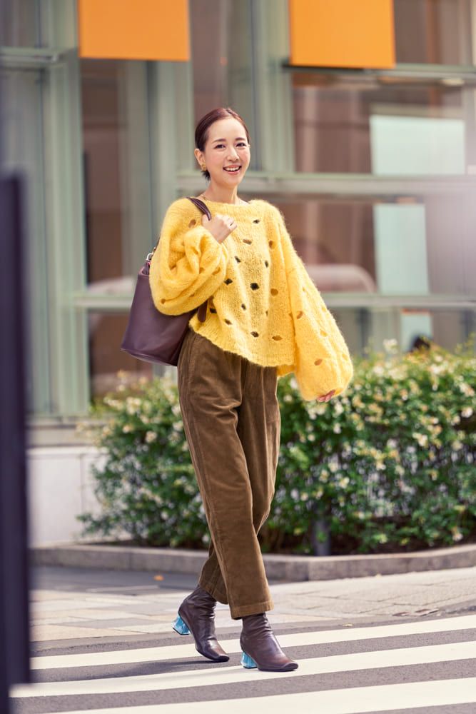 「ブラウンパンツ」が個性派ニットを際立ててオシャレにまとめる