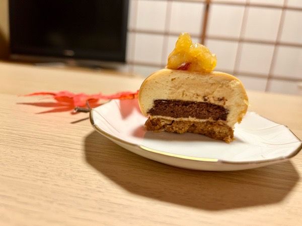 「オートンヌ」は、さつまいも「仙台金時」を使った滑らかなムースとメイプルのクリームブリュレが優しいくちどけで、土台のくるみ入りのガレットがサクサクと香ばしく、奥深い味わいに感動。