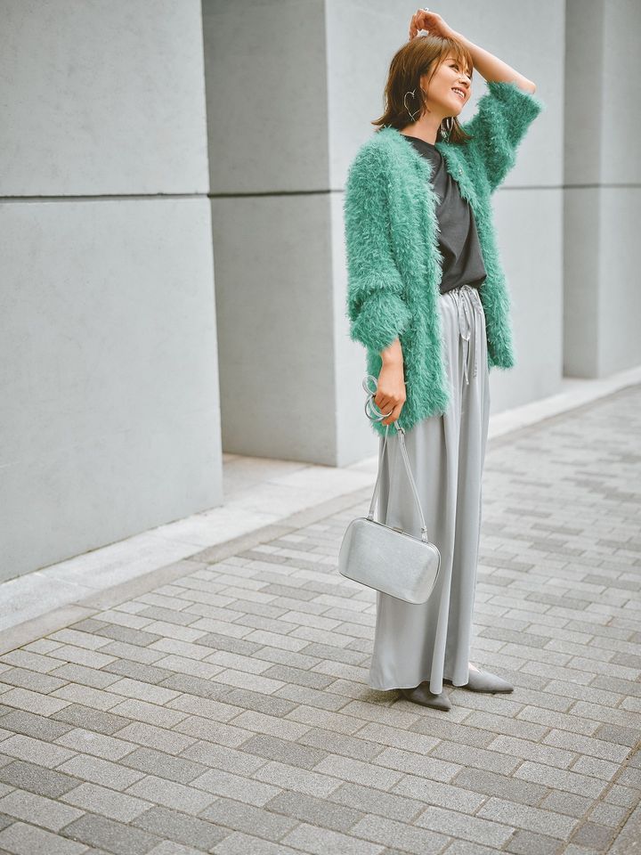 カーディガン¥27,500(アルアバイル)Tシャツ¥10,450パンツ¥39,600(ともにカオス/カオス丸の内)バッグ¥45,100(ヴァジック/ヴァジックジャパン)パンプス¥35,200〈シーセイ〉ピアス¥62,700〈ヌゥ ユゥ〉(ともにアイネックス)リング¥41,800(マリハ)