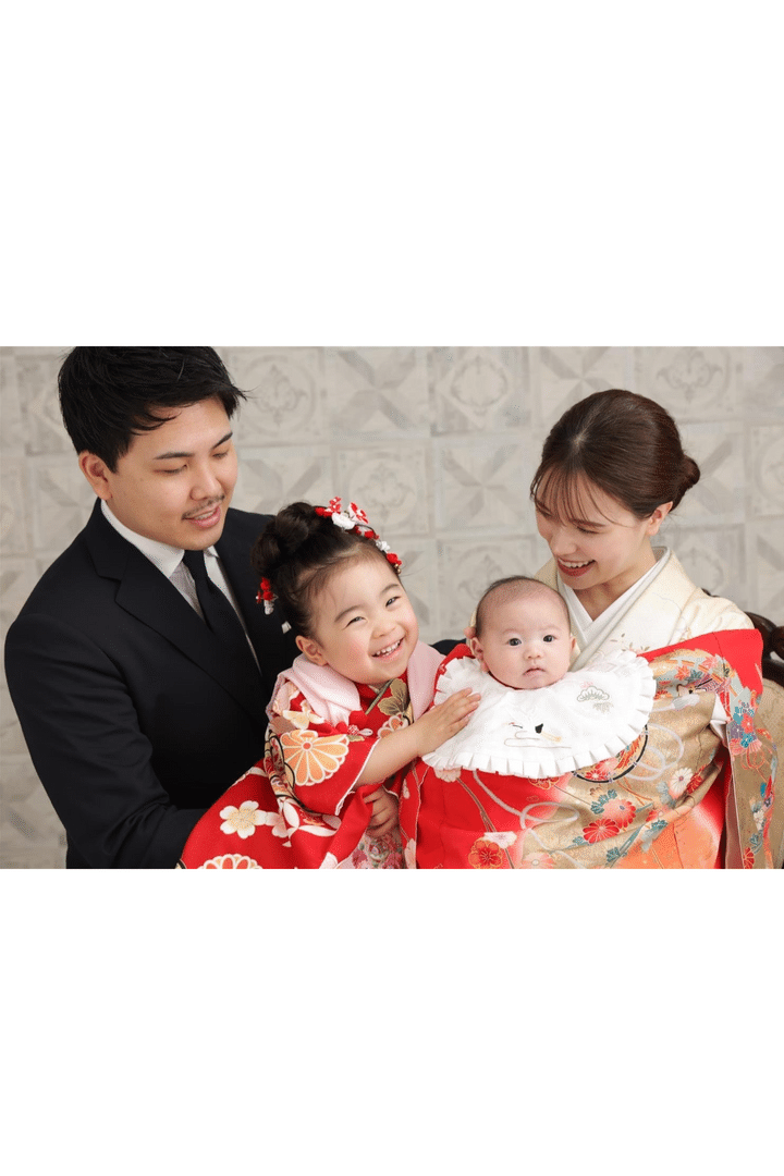 「娘の七五三のときは産後2カ月。バタバタしていたので、準備し始めたのは実施の数週間前のことでした。まずスタジオの予約を取り、ネットショップの『きもの365』で着物をレンタル。娘が赤色の着物を選んだので、私は娘を引き立てるために白地でシンプルなものに。草履やバッグなど小物も一式付いてきたので便利でした。店舗で選ぶより色も柄も豊富だったので、ギリギリでも希望のものを選ぶことができてよかったです。クリーニングに出さずそのまま返却するだけでよかったのも助かりました。知り合いに着付けの先生がいるので着付けとヘアをお願いし、仕上げてからスタジオに向かいました」長坂南穂さん・31歳/160㎝(4歳と1歳の女の子ママ)