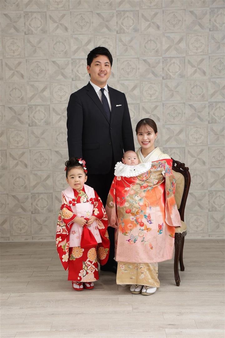 「ネットの『きものレンタル宅配便』でお借りしました。出張カメラマンにお願いしたので着付けやヘアは別で予約をしたのですが、息子、娘、私の3人の着付けが必要だったので出張着付けに。お詣りは12月にしたのでそこまで混んでいなかったのですが、3人分の希望枠が取れるよう、3カ月前の9月ごろに予約をいれました。子どもたちは着たまま遊んでしまうので、私の着付けとヘア→娘のヘアと着付け→息子の着付けの順に。準備が楽で種類が選べるレンタル着物はよく利用していて、次男のお宮参りでは同じく楽天の『きものレンタル パラダイス』で借りました。こちらも種類が豊富でよかったです」吉田幸奈さん・35歳/168㎝(6歳の男の子と4歳の女の子と2歳の男の子ママ)