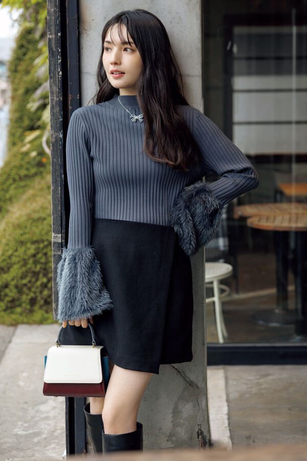 リュクスなファーのベルスリーブで一目置かれる存在感を放って。袖元にファーをあしらったモックニットは、ショートボトムを合わせて重軽バランスをメイク。ダークカラーでまとめれば、シャレ見えしながら落ち着いた雰囲気にまとまります。