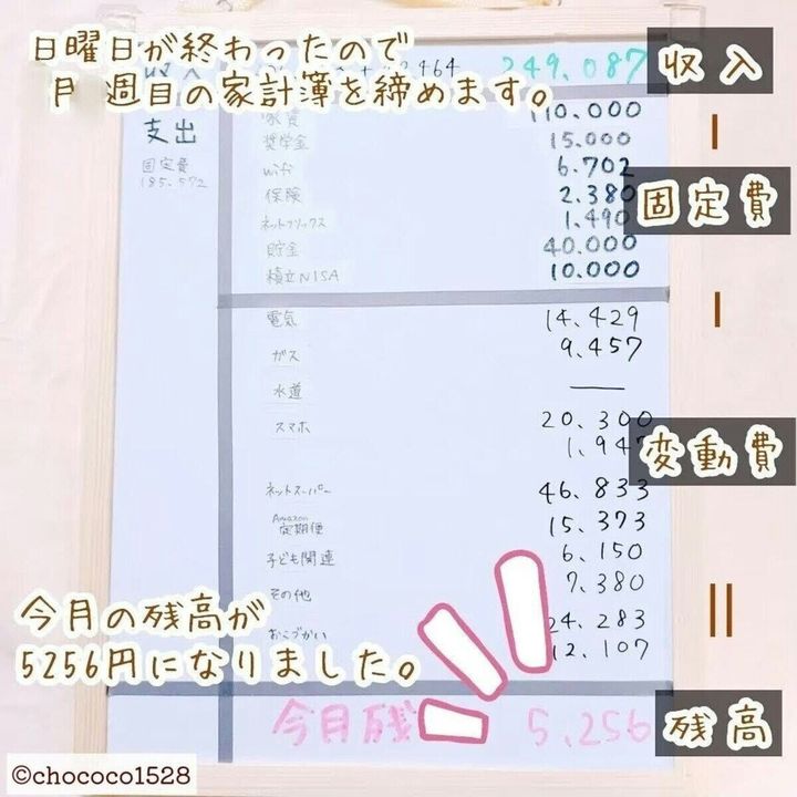 わが家はホワイトボードで常に家計簿を見えるようにしているので、家計簿アプリを開く手間なく残高がわかります。