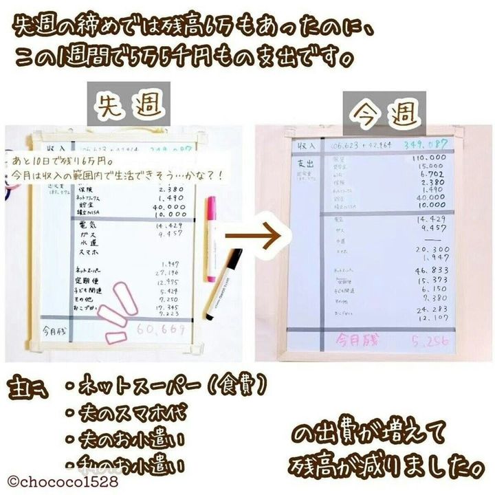 普段使っている家計簿アプリは、残高表示は小さく見づらいのが難点に。そのため、わが家ではホワイトボードを使って日々の残高を大きく表示するようにしています。ホワイトボードを使えばすぐに金額を書き換えられますし、私だけでなく夫も残高把握ができるのも良いです。