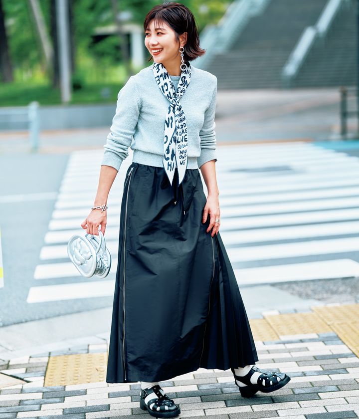 スカート¥46,200(ダブルスタンダードクロージング/フィルム)ニット¥19,910(ユナイテッドアローズ/ユナイテッドアローズ 六本木ヒルズ店)スカーフ¥42,900(マディソンブルー)バッグ¥161,700(ピエール アルディ/ピエール アルディ 東京)サンダル¥26,400(ツル バイ マリコ オイカワ)ソックス¥1,100(靴下屋/タビオ)ピアス¥58,300(ブランイリス/ブランイリス トーキョー)ブレスレット¥26,400(シーエックスシー/アマン)リング¥45,100(ガルニ/ガルニトウキョウ)