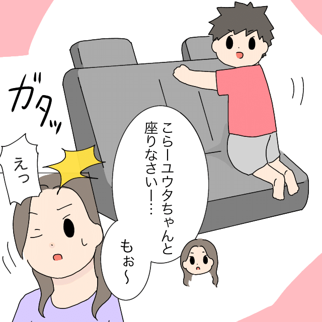 シートベルトはもちろん、ジュニアシートにも乗らず、背もたれに沿うように膝立ちしているユウタくんを見て、ユウタくんママは息を呑みました。