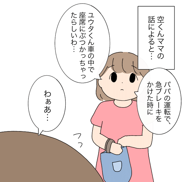 そんな時に聞いたユウタくんが骨折したという話。空くんママの話によると、パパの運転で急ブレーギをかけた時に、車の中で座席にぶつかってしまったユウタくん。