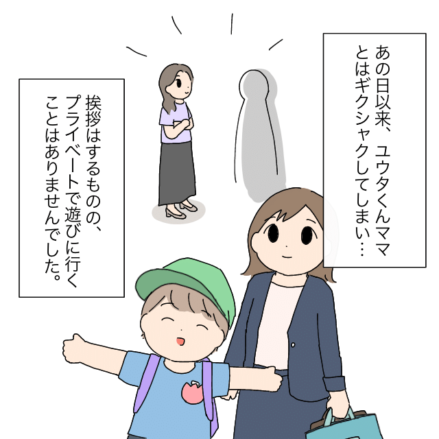 ママ友達と大きな公園に出かけた以来、ユウタくんママとぎくしゃくしてしまったいくこさん、挨拶はするものの、プライベートで遊びに行くことはありませんでした。