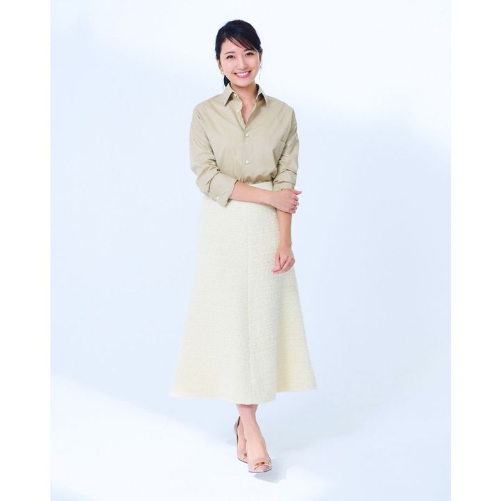 ベージュシャツ37,400円 オフホワイトツィードスカート132,000円(マディソンブルー)パンプス130,900円(セルジオ ロッシ)ピアス770.000円(ブチェラッティ)