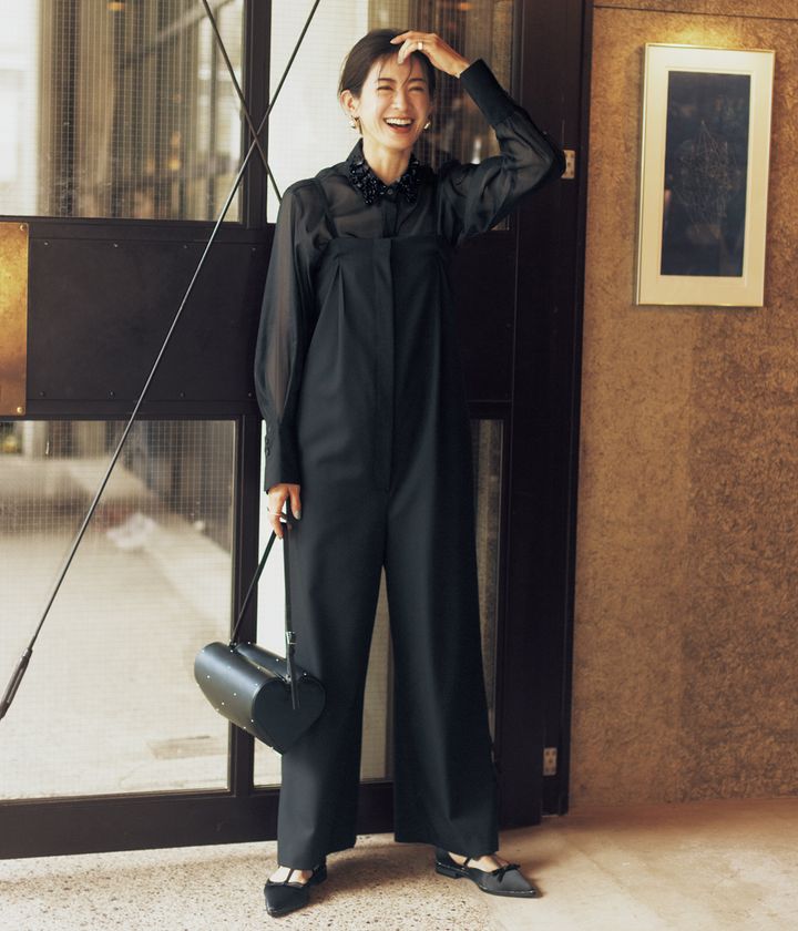 5位 【40代の黒コーデ】旬のサロペも甘さも肌見せもALLブラックなら挑戦できる!