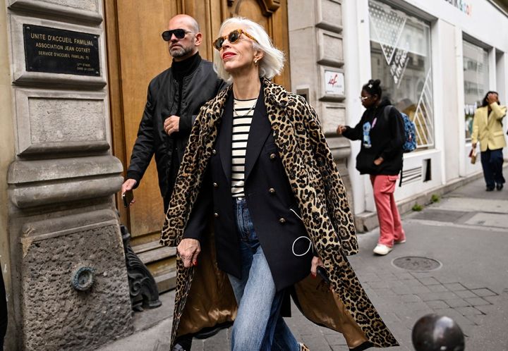 NYの老舗百貨店バーグ ドルフ グッドマン、バイイング・ディレクターのリンダ・ファーゴは金ボタンのジャケットにデニムを合わせて、王道フレンチシックな装いでサカイ(SACAI)のショーに来場。今季トレンドのレオパード柄コートを軽快に羽織ったレイアードスタイルは是非取り入れたい上級者テクニック。